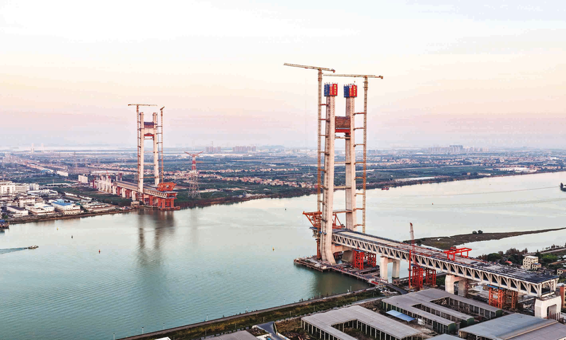 洪奇沥水道公铁大桥采用双塔双索面半漂浮体系,施工难度与技术含量位居同类工程前列。其中,合建段主桥长度1.411公里,主跨808米,创新性采用世界首创的公铁合建超短边跨钢混箱桁组合梁斜拉桥新结构体系。大桥上层为八车道城市快速公路,下层为四线高速铁路,可实现公铁交通的高效融合。
