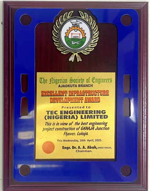 为充分肯定中铁国际川铁国际尼日利亚公司在科吉州洛克贾城市立交桥项目建设中的重大贡献,近日,尼日利亚工程师协会(NSE)授予川铁国际尼日利亚公司“卓越基础设施建设成就奖”荣誉奖牌,这也是企业第二次荣获该奖项。