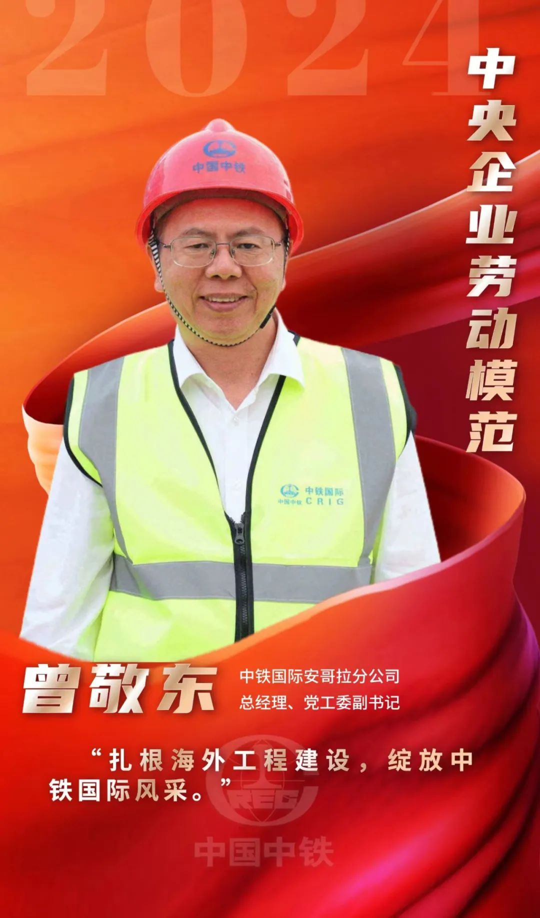 曾敬东,高级工程师,现任中铁国际安哥拉分公司总经理。参加工作30余年来,常年坚守海外、深耕一线,历任中铁国际经济合作有限公司经营二部副总经理、总经理,中铁国际巴新公司总经理等职务,个人曾荣获全国铁路总工会“火车头”奖章。