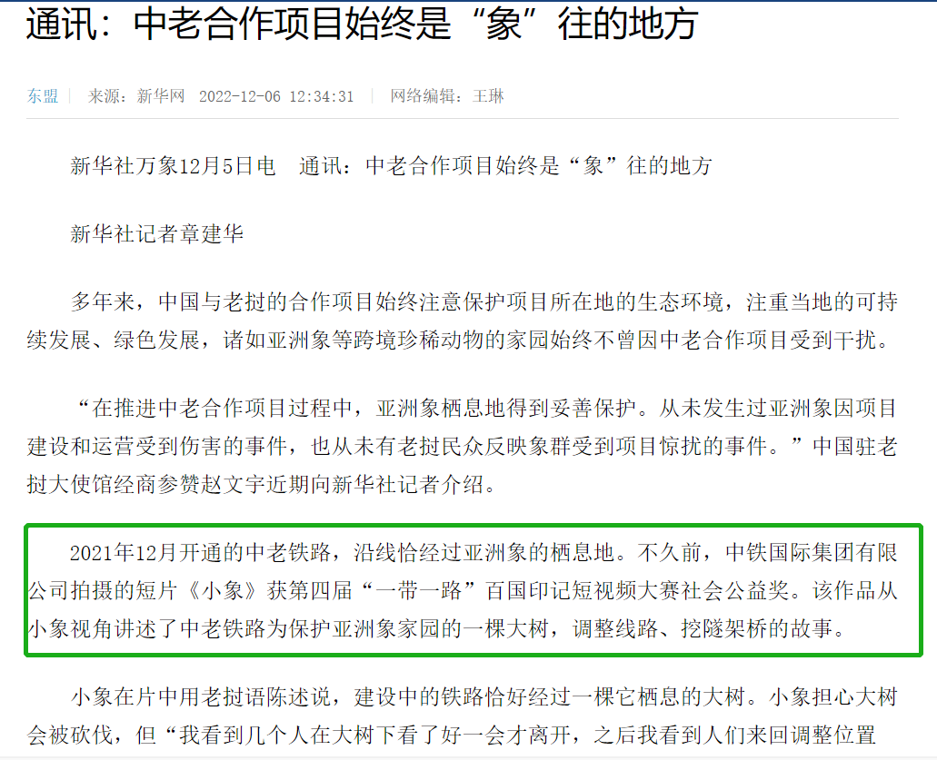 《小象》视频从一只小象的独特视角,讲述了中老铁路为保护亚洲象家园的一棵大树,调整建设线路、挖隧架桥的故事。作品获奖发布后,新华社老挝分社以长篇通讯《中老合作项目始终是“象”往的地方》为题特别报道,并被包括光明日报、人民网、新华网、中工网在内的17家中央主流媒体和264家媒体纷纷转载,引起热烈的社会反响,为企业的品牌建设营造了良好的社会舆论氛围。