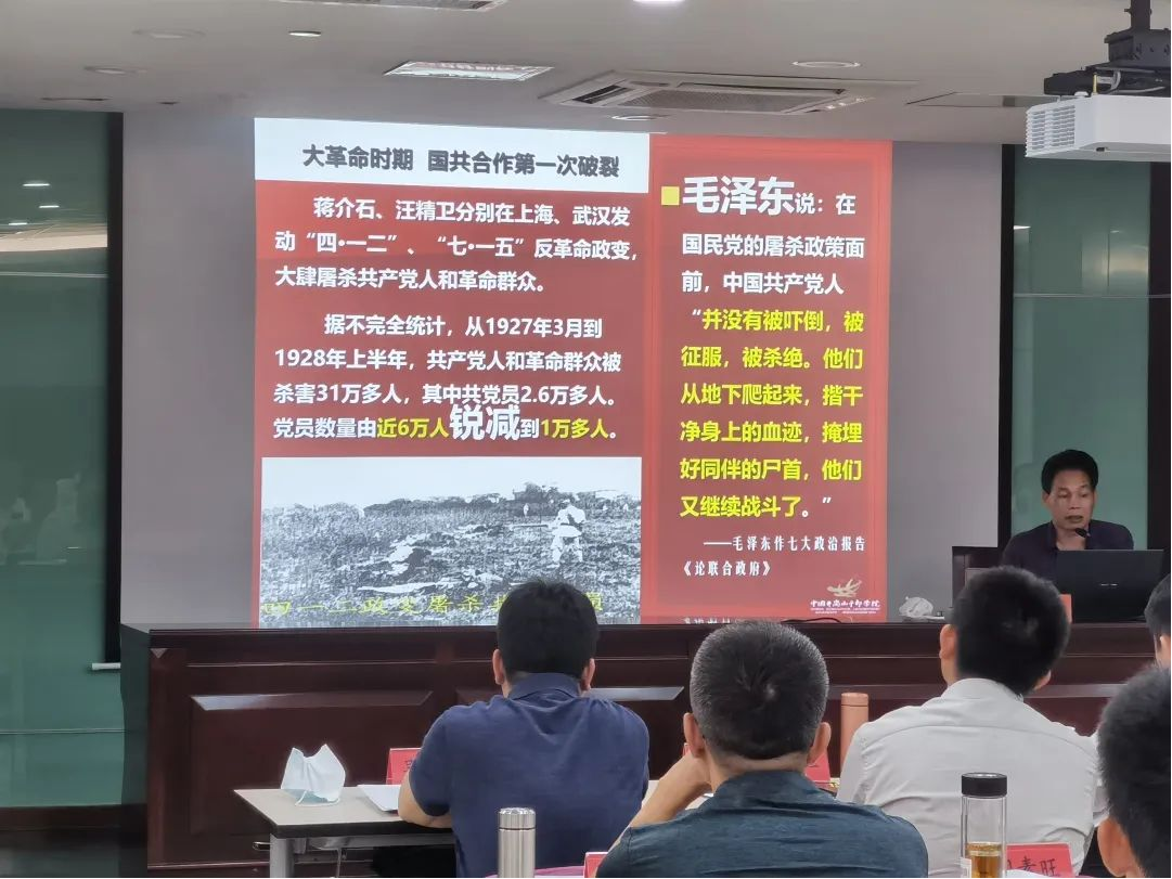 ▲中国井冈山干部学院副院长柯华讲授开班第一堂党课