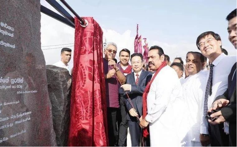 当地时间2月23日16时,在近万名当地民众的欢呼声中,斯里兰卡总统戈塔巴雅、总理马欣达和中国驻斯大使程学源共同为斯里兰卡南部高速延长线项目通车剪彩揭幕。