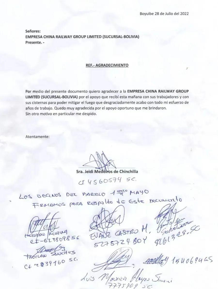 英国“ENP NewsWire”新闻网2022年8月26日报道,当地时间7月30日,中国中铁玻利维亚Espino公路项目三分部收到一封当地民众联名签字的感谢信。当地民众在信中对项目工作人员及时组织灭火抢险、拯救当地民众生命财产的英勇表现表示感谢。报道称,7月28日7时,玻利维亚Espino公路项目三分部驻地附近的Boyuibe市区一家店铺突发火灾,火情十分严重。在接到当地民众的求救后,正在路基工地现场施工的三分部人员立即采取应急措施,出动了3台洒水车、1辆中巴车以及8名工人赶往事故现场,全力抢险救援,及时阻止了火势蔓延,拯救了当地民众的生命财产。火灾过后,项目部还组织工作人员帮扶受灾家庭,检修过火房屋的水电情况,避免二次灾害的发生,确保当地民众尽快回归正常生活。