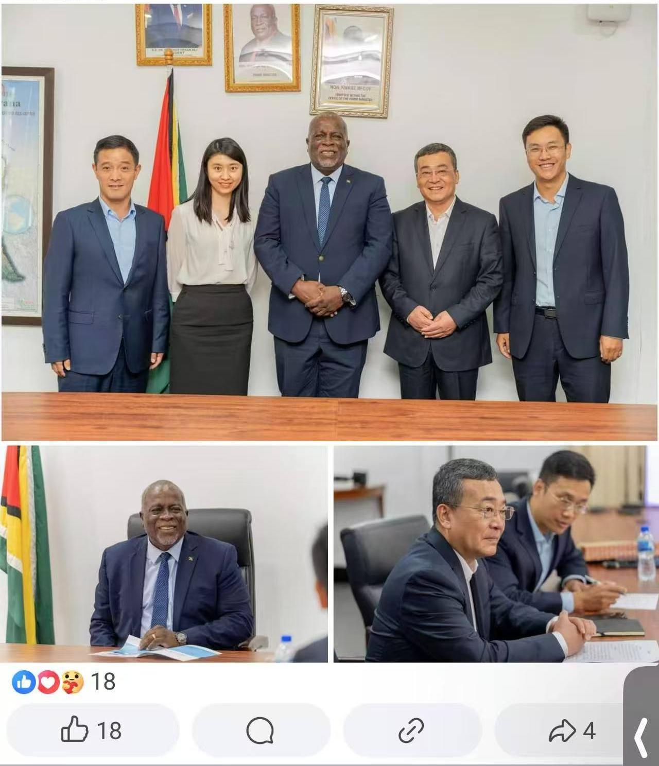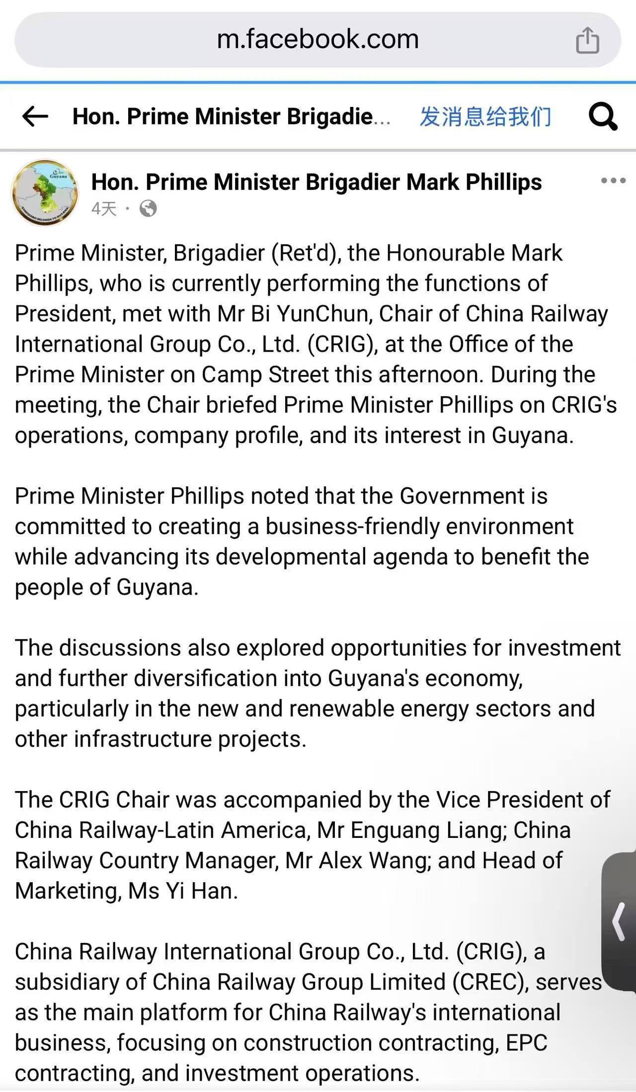 Prime Minister, Brigadier (Ret'd), the Honourable Mark Phillips, who is currently performing the functions of President, met with Mr Bi YunChun, Chair of China Railway International Group Co., Ltd. (CRIG), at the Office of the Prime Minister on Camp Street this afternoon. During the meeting, the Chair briefed Prime Minister Phillips on CRIG's operations, company profile, and its interest in Guyana.