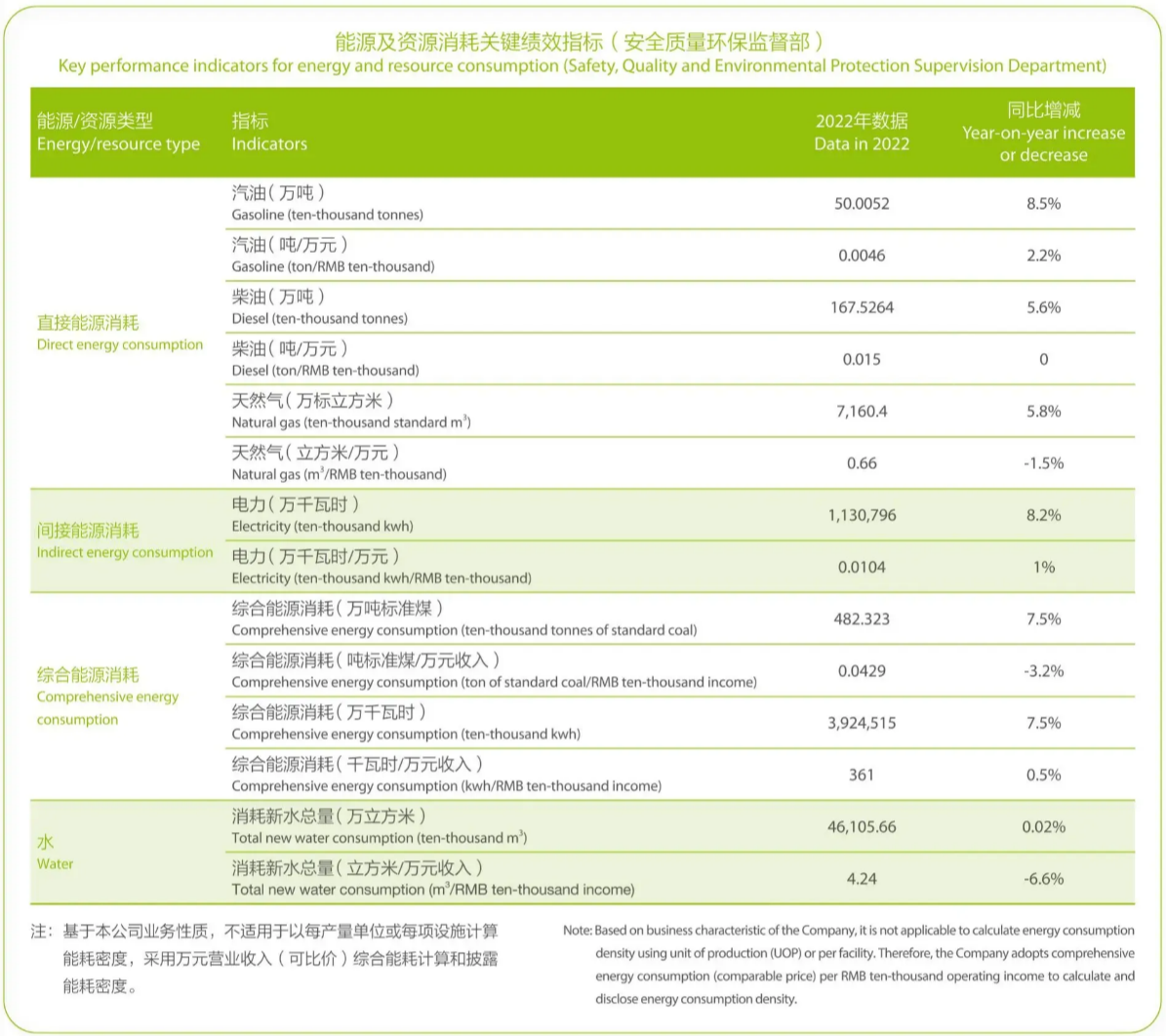 In 2022, the comprehensive energy consumption (comparable price) pelRMB ten-thousand operating income was 0.0429 tons of standard coal)RMB ten-thousand, down 3.16% from the same period of last year; the CO.emission was 0.1502 tons/RMB ten-thousand, down 3.8% from the sameperiod of last year, accomplishing the annual target of energy conservationand environmental protection.