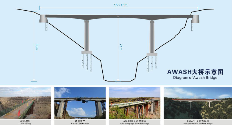 Awash grand bridge was built over Awash River. The terrain is so steep that the elevation difference between river valley and platforms on both sides is about 80m. The length of Awash grand bridge reaches 155.45m, the height 71m. The bridge adopts (40+64+40)m pre-stressed concrete continuous beam. It is also the first pre-stressed concrete continuous beam bridge built in Ethiopia. Awash grand bridge adopts rectangular hollow pier, T-shape abutment, and pile foundation. Pier construction adopts climbing formwork method while continuous beam construction adopts symmetric light basket cast in cantilever method.