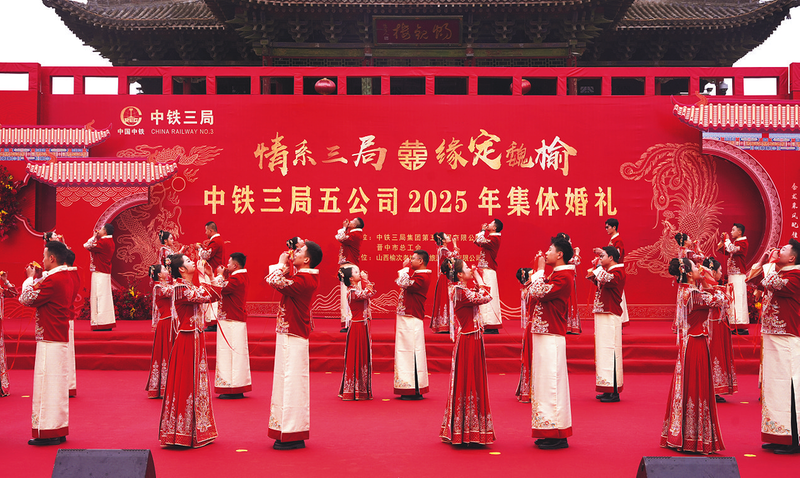 9月17日,一场以“情系三局 缘定魏榆”为主题的员工集体婚礼,在山西晋中榆次老城浪漫启幕。35对来自中铁三局五公司全国各重点工程项目的新人,在亲朋好友的祝福中,携手踏上红毯,一同许下相伴一生的承诺。图为新人们共饮合卺酒。 任琬抒 张鹏波 摄影报道