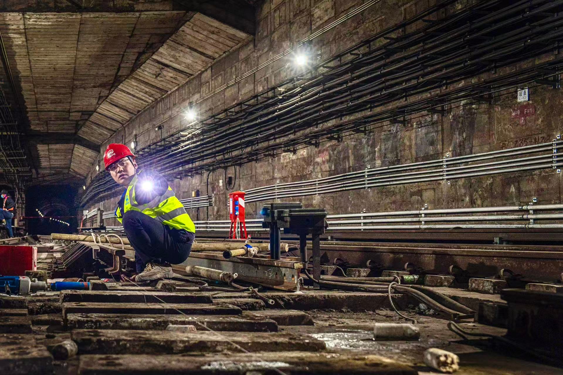 “为配合建国门站道岔设备施工改造,北京地铁1号线建国门站、东单站、永安里站临时封闭。请您合理安排出行,感谢您的理解与配合。”10月18日22时,随着站内广播声最后一遍响起,列车较往日提前停止运行。在收到接触轨断电的通知后,中国中铁旗下中铁四局110余名施工作业人员身穿反光背心,开启爆闪肩灯,脚踩绝缘鞋,顶戴安全帽、头灯,开始了持续8小时的道岔改造紧张施工。