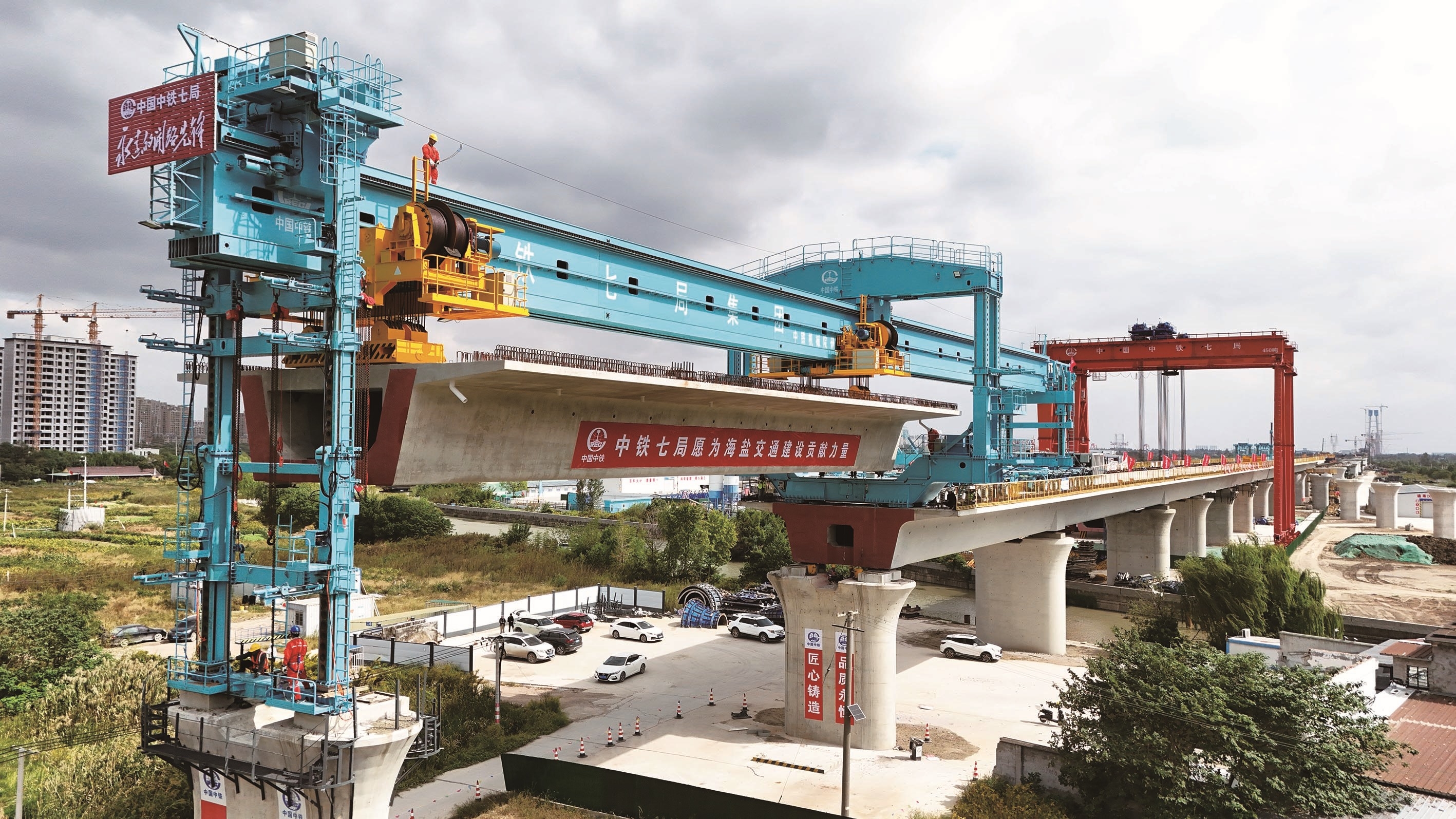 10月22日,在中铁七局通甬高铁项目施工现场,架梁作业人员精心操作中铁工业旗下中铁科工自主研制的JQSD1000型架桥机,将一孔长32米、重697吨的箱梁精准架设在通甬高铁海盐特大桥E段874号-873号墩上,宣告通甬高铁站前Ⅸ标箱梁架设施工正式启动。