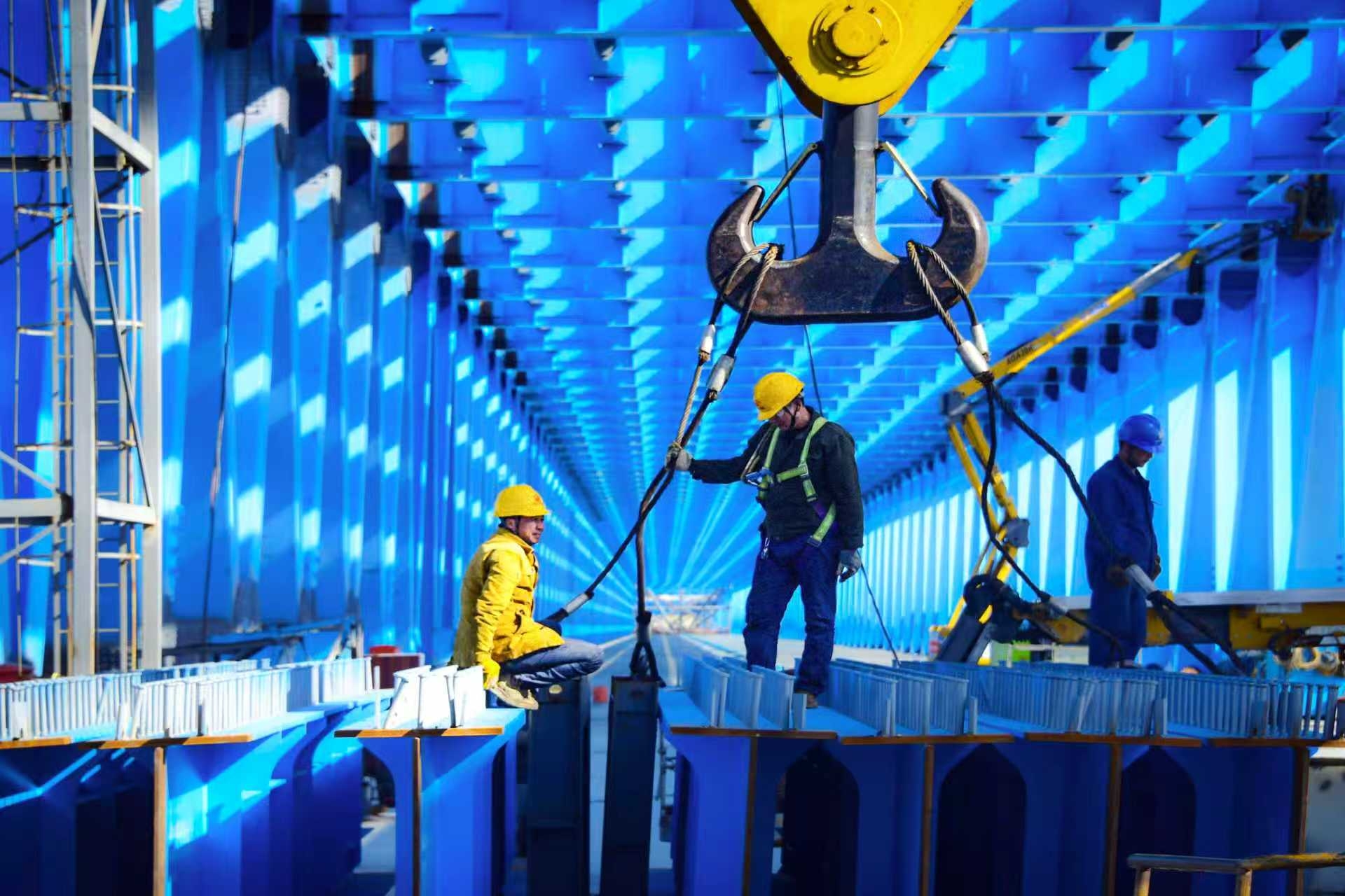 10月31日,随着一根长21.2米、高1.92米、重34.61吨公路横梁杆件吊装组拼就位,中国中铁旗下中铁大桥局承建的新建上海至南京至合肥高速铁路(简称沪宁合高铁)崇启公铁长江大桥主桥非通航孔桥钢梁公路横梁吊装组拼全部完成。