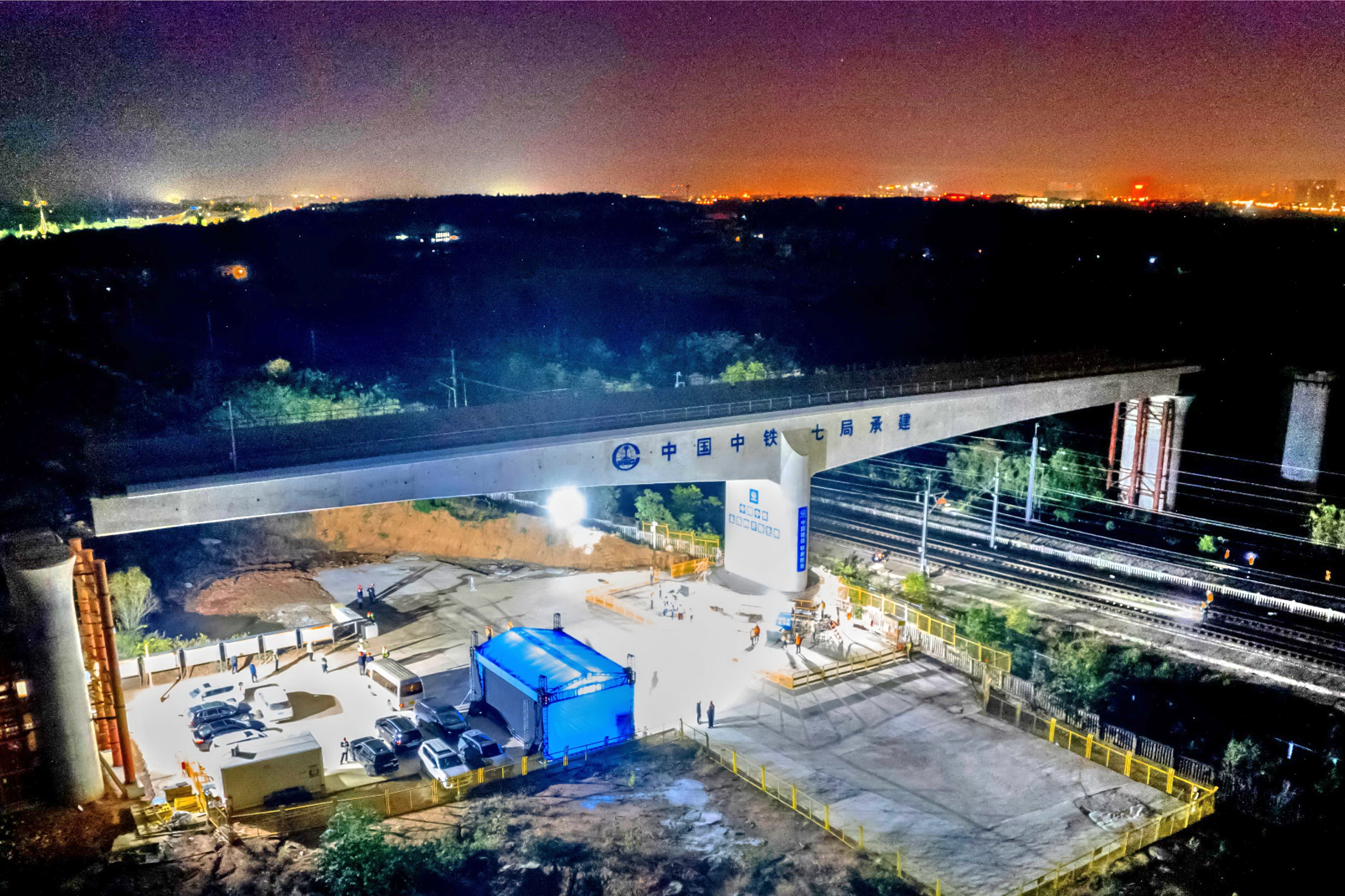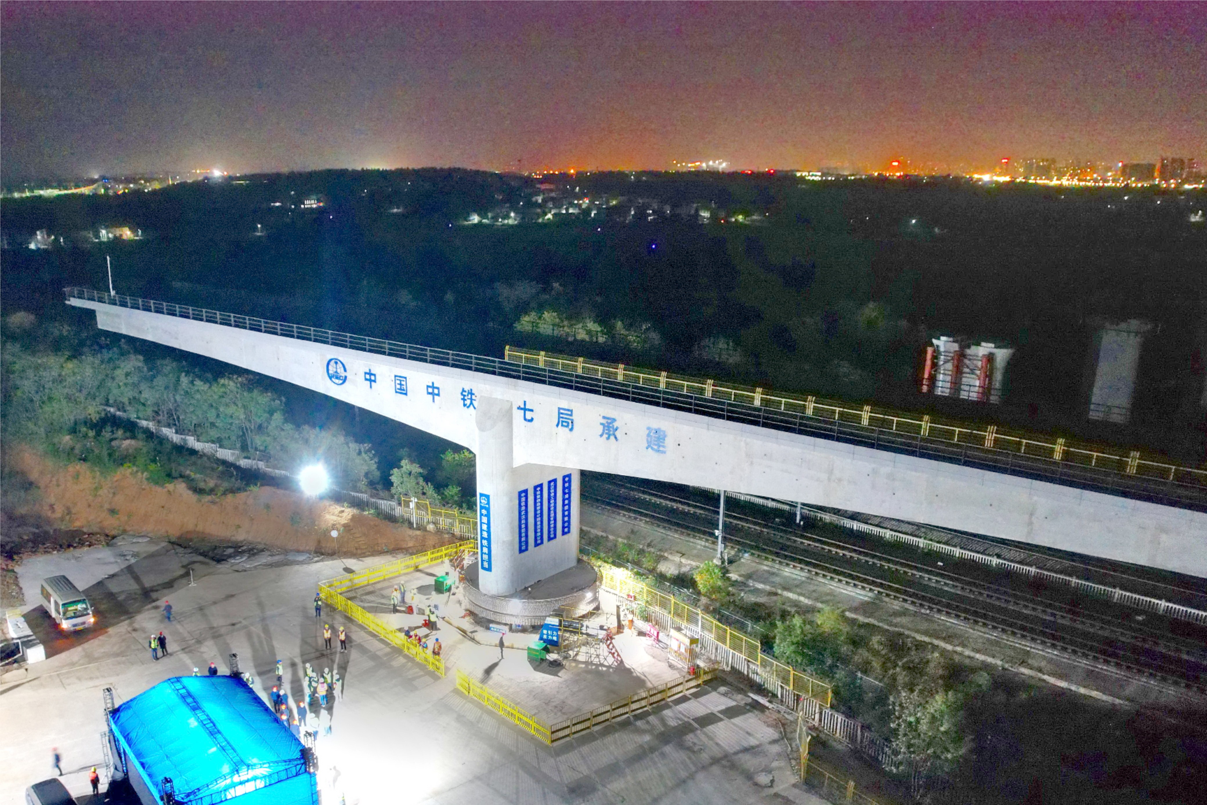塘埠口滠水特大桥位于武汉市黄陂区,全长21.9公里,是新建合武高铁湖北段控制性工程。本次转体T梁长112米、宽12.6米,总重6000吨,逆时针旋转83度,跨越京广高铁、沪蓉铁路下行线等三条铁路线,安全风险高。