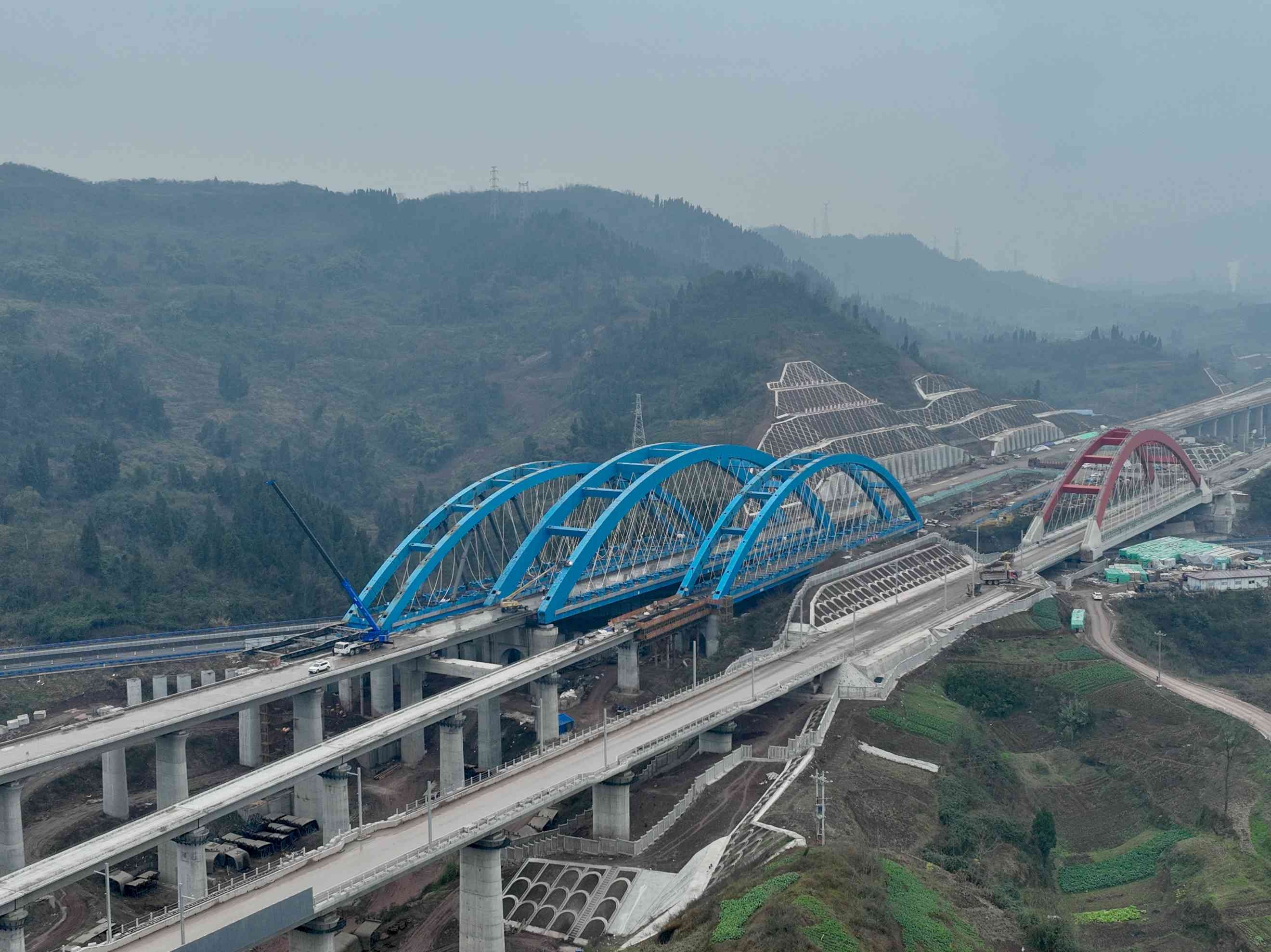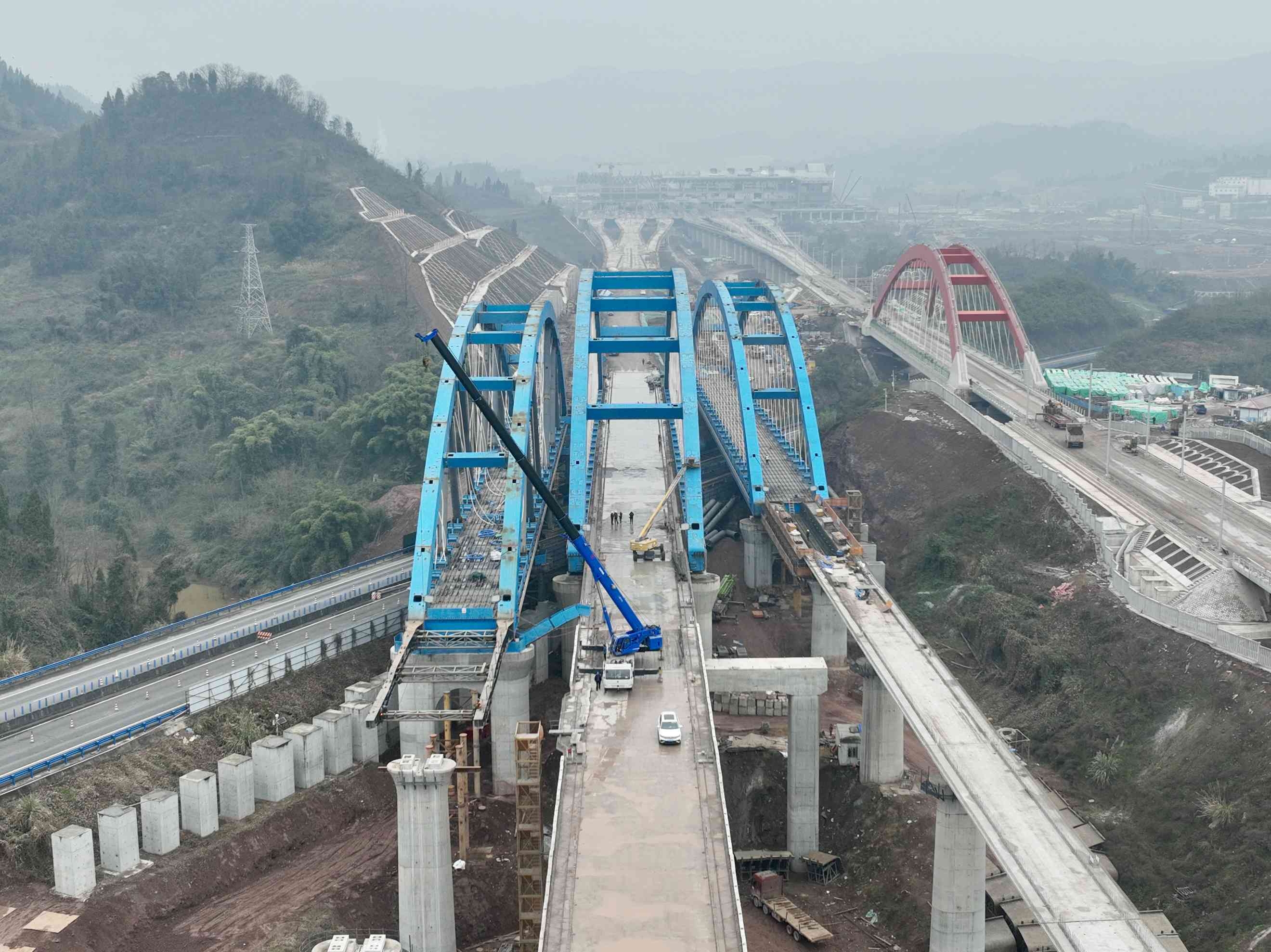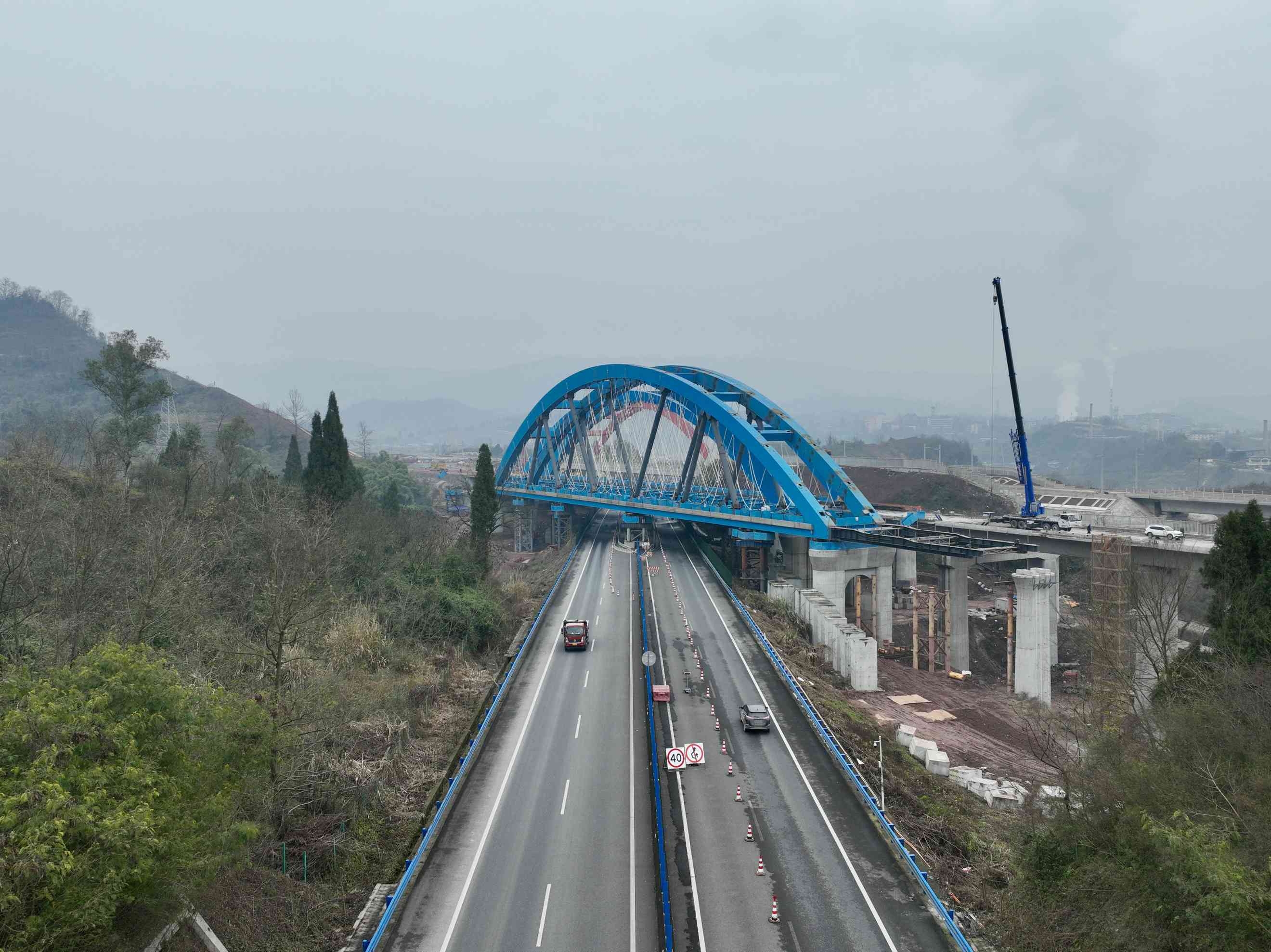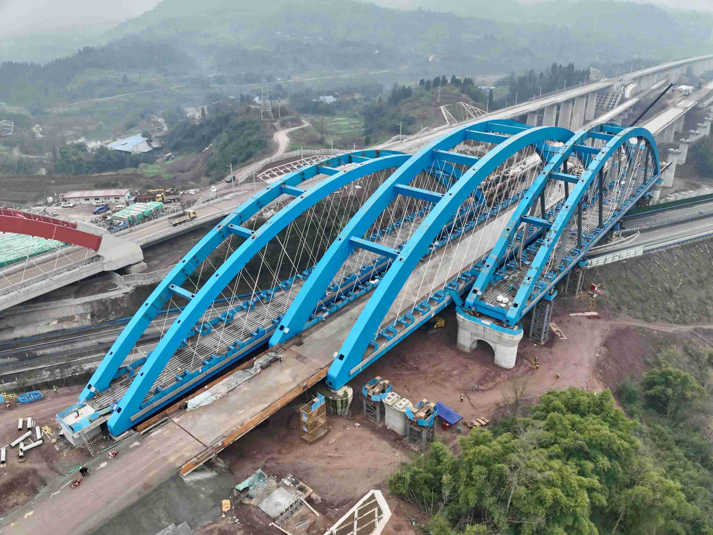 西渝高铁康渝段跨营达高速公路大桥位于四川省达州市境内,全长443.1米,是西渝高铁自达州南站引出后跨越营达高速公路的关键节点,由正线及左、右联络线3幅桥梁组成,此前主拱桥、左联桥已先后完成顶推作业。为增加桥梁刚度,创新采用网状吊杆,优化荷载分布,受力更加合理;桥梁梁拱钢结构在桥外路基整体拼装,通过公路旁不对称临时支墩顶推就位,最大限度降低桥梁施工对桥下高速公路运营干扰。