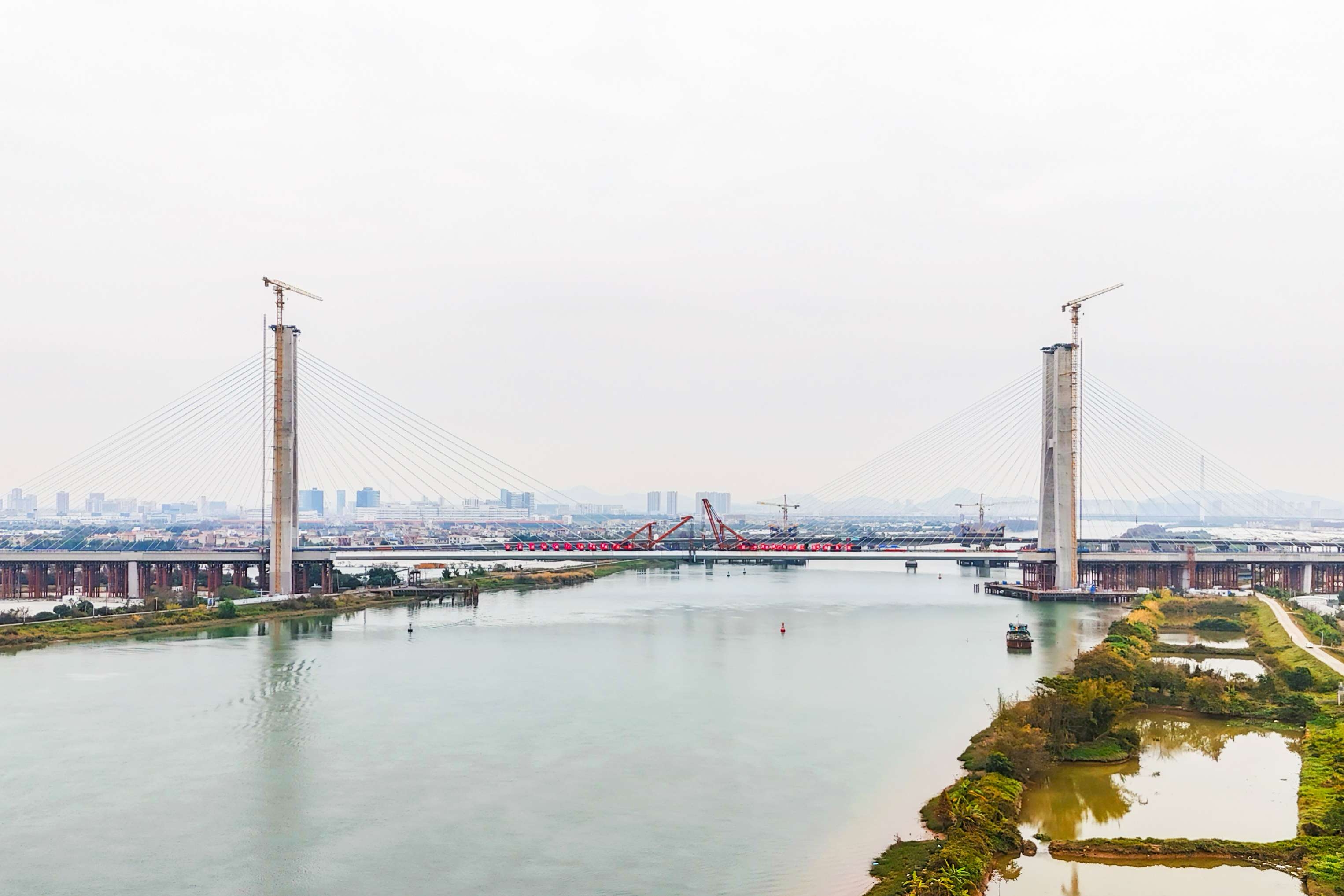 2月10日,随着一段长6米、宽17米、重约72吨的钢梁吊装就位,中国中铁旗下中铁广州局承建、中铁工业参建的国内首座大跨度双边主梁混合组合梁高速铁路斜拉桥——新建深圳至江门铁路(简称深江铁路)广中江特大桥跨鸡鸦水道主桥合龙。