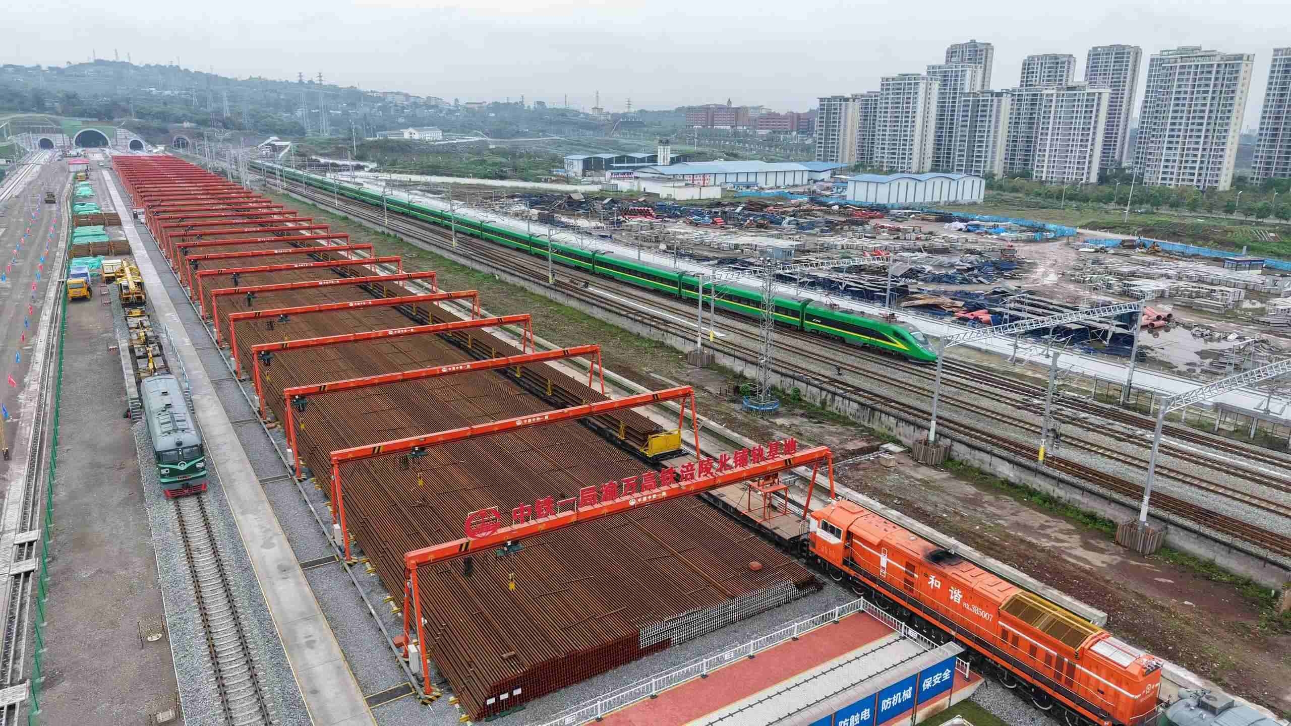 4月3日,在重庆市涪陵区涪陵北站施工现场,中国中铁旗下中铁一局将首对500米长钢轨平稳铺设在无砟轨道道床上,标志着新建重庆至万州高速铁路(简称渝万高铁)正式进入铺轨施工阶段。