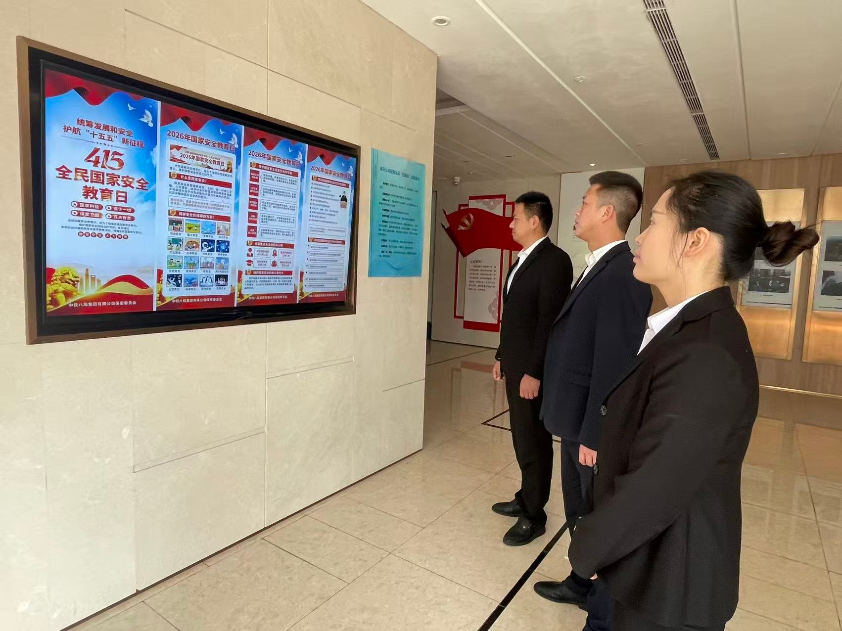 近日,中铁八局房开公司在驻地办公楼电子屏、食堂等场所播放张贴2026年国家安全教育日系列海报,利用LED屏滚动播放国家安全宣传图片资料,在工作群发布电子宣传册以直观方式推动国家安全知识入脑入心,营造“国家安全、人人有责”的浓厚氛围。饶然)