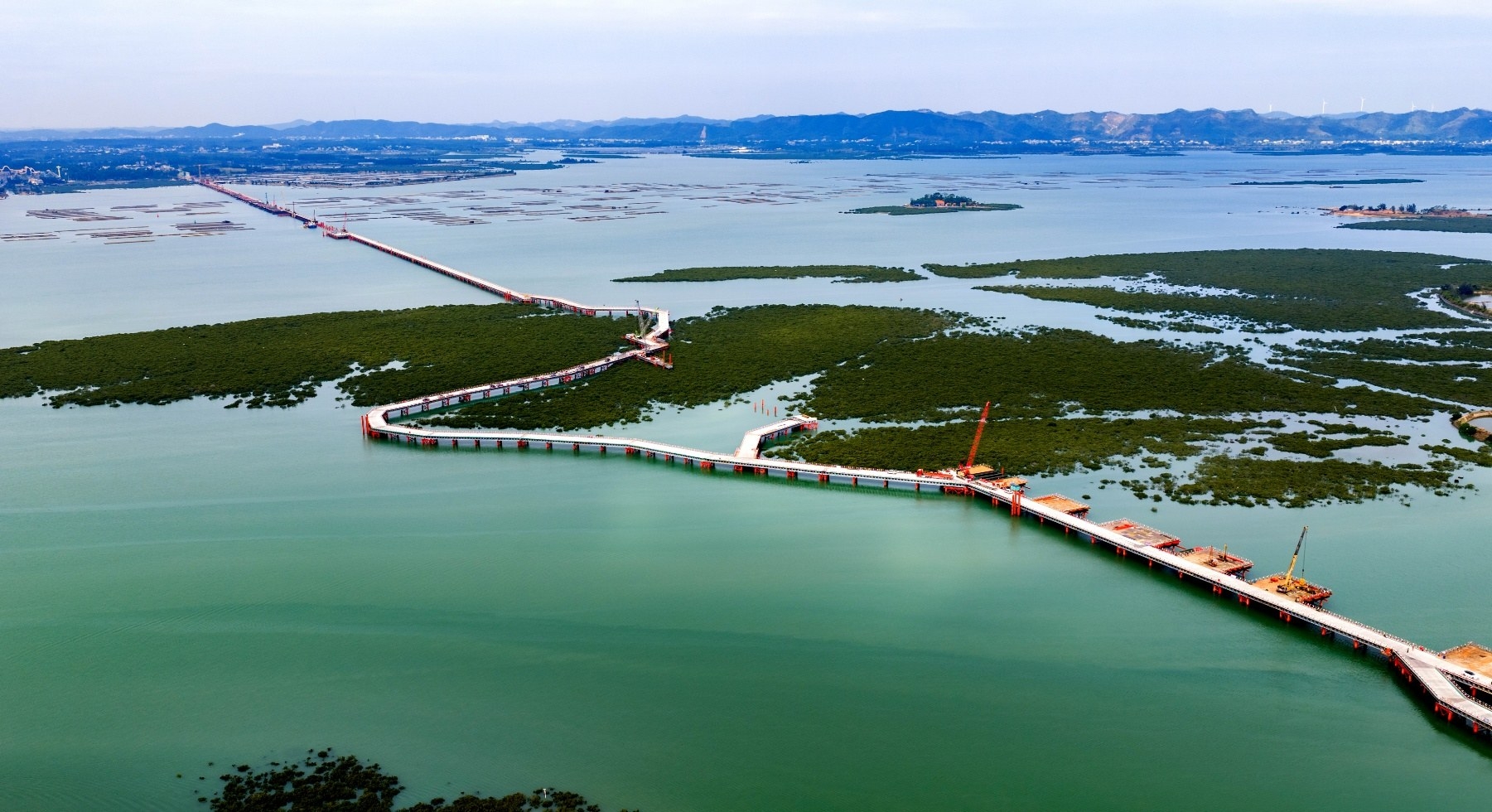 中铁大桥局合湛高铁广西段3标是全线唯一跨越红树林稀有物种的标段,尤其是铁山港跨海大桥140号墩至164号墩区间,是合湛高铁全线红树林最集中的区域。为了避让红树林,栈桥“拐了”大大小小的弯至少11次。为此,线路长度较直线布置也增加了一倍,从原本的2公里多延长至4公里,施工成本也随之大幅增加。不仅仅是栈桥为红树林让路,中铁二院在铁路主线桥梁设计时,也考虑到对红树林减轻影响。全桥222个墩柱大部分为简支梁结构,墩柱间距32米。而在跨越红树林的关键路段采用了连续梁结构,桥墩间距增加到128米。采用连续梁结构后,可减少33个桥墩,这意味着红树林就多了33处生长空间。从栈桥的“主动拐弯”到桥墩的“刻意减少”,建设者从设计源头上最大限度降低了工程对红树林的影响,真正实现了“修桥不毁绿,通路更护绿”。
