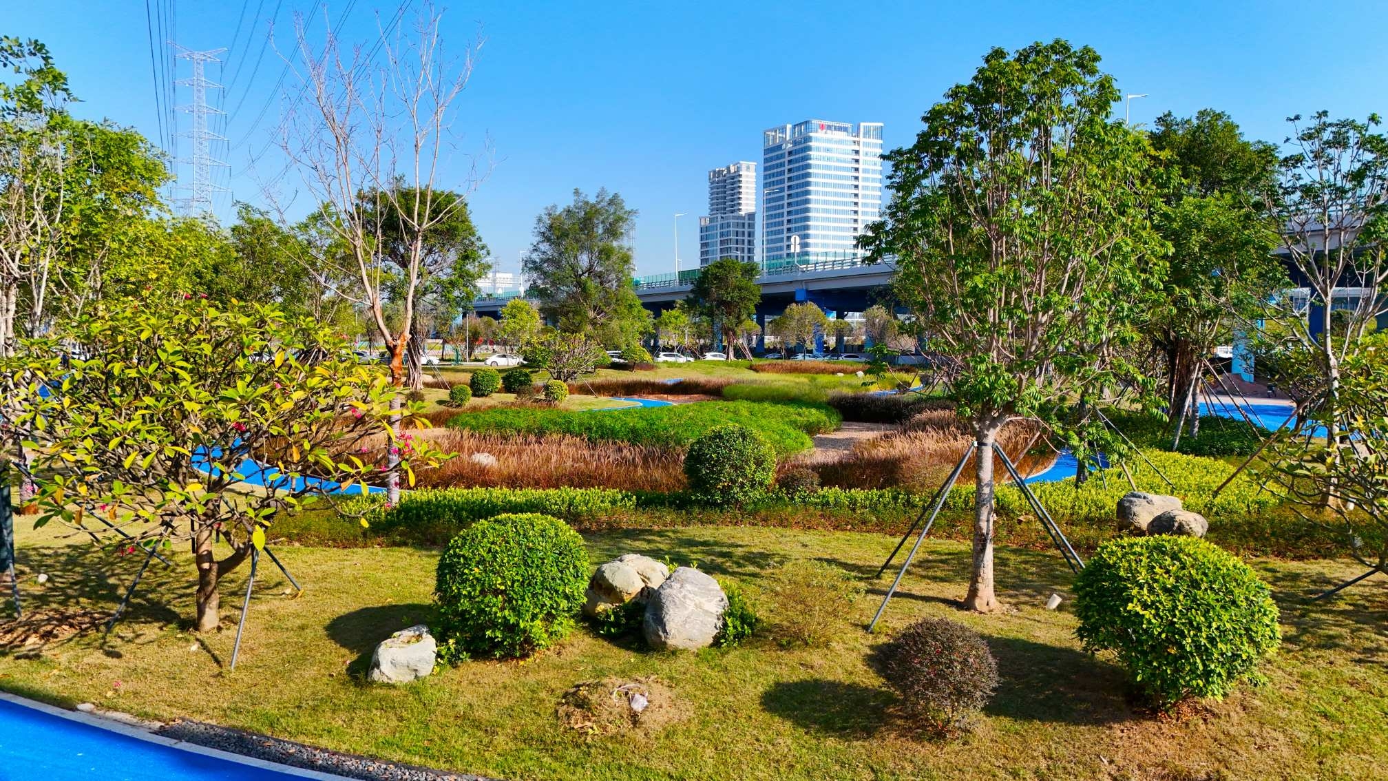 在广州南沙,一幅“水清、岸绿、城融”的生态画卷正徐徐展开。中铁六局承建的城市绿地系统工程正以绿色为笔、环保为墨,将12个工程单元、约89.47万平方米的土地织就成一片生机盎然的城市“绿肺”。项目团队以“生态优先、环保先行”为原则,针对河涌水系,通过生态驳岸修复与水生植物配置,重塑水陆交错带的生物多样性;防护绿地则发挥滞尘、降噪、固碳功能,特别是南二环桥下空间,从“被遗忘的角落”变身为层次丰富的生态廊道;街头绿地的点缀,让市民“推门见绿、移步入园”成为日常。