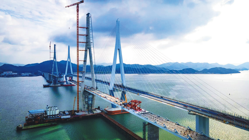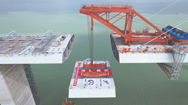 10月16日,随着大桥北侧边跨预制箱梁精准嵌入合龙口,中铁大桥局承建的宁(波)象(山)城际铁路象山港跨海大桥北侧边跨合龙。宁象城际线路长约61.45公里,其中全长8276米的象山跨海大桥为全线控制性工程,是主跨为688米的组合式钢箱梁斜拉桥。大桥建成后将创下“国内首座市域(郊)铁路跨海大桥”“国内最大跨度组合式钢箱梁铁路斜拉桥”等多项记录。本次合龙吊装的北侧边跨钢箱梁长15米、宽21.6米、高4.5米,重227.3吨。 许潇凯 谭春峰 摄影报道