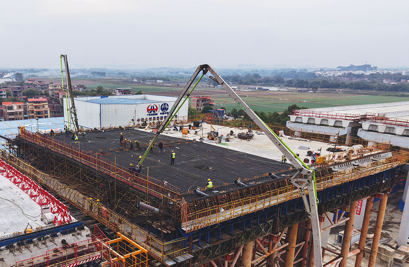 北江特大桥主桥全长1440米,设计为主跨360米四塔双索面半漂浮体系混凝土梁斜拉桥,是目前国内同类规模最大桥梁。本次完成的边跨现浇梁全长40.33米、宽37.6米、高3.6米,分两次浇筑,累计浇筑混凝土2262立方米。图为主桥整体和边跨浇筑。 杨启颜 邹磊 摄影报道