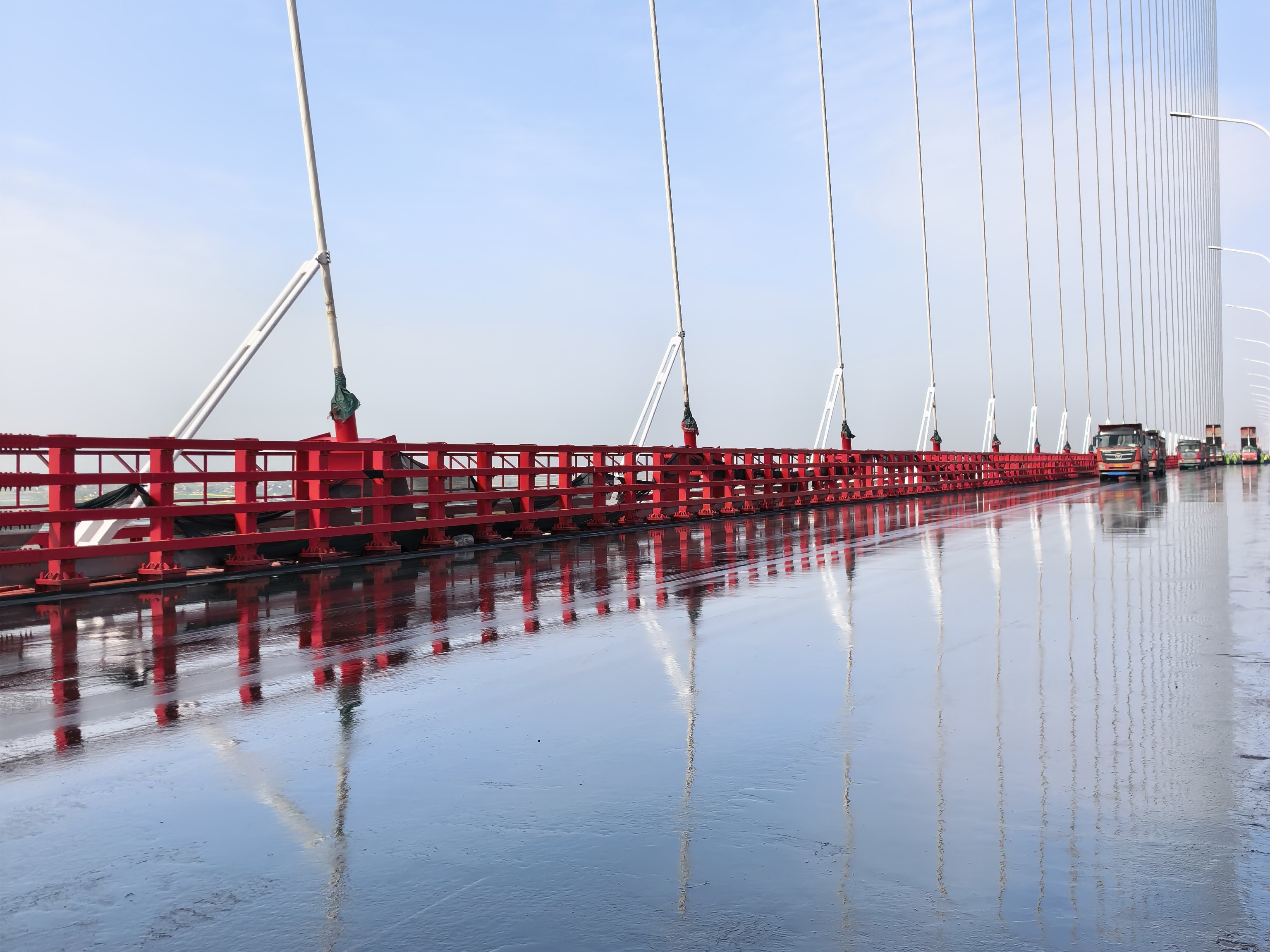 大桥钢桥铺装层设计总厚度60毫米,采用国内领先的“改性聚氨酯混凝+SMA改性沥青混凝土”复合结构。主汊航道桥长3248米,本次钢桥面铺装总面积近8万平方米,相当于11个标准足球场并列排开,预计4月上旬铺装完成。