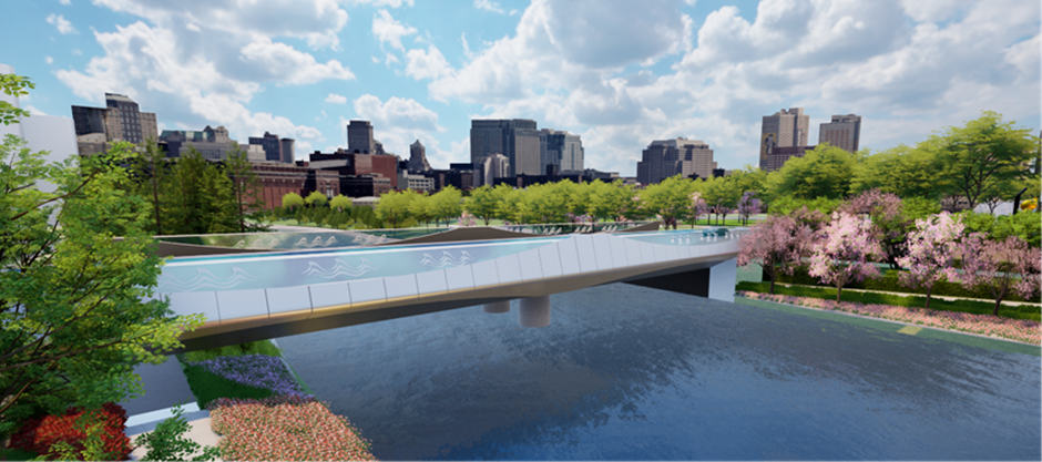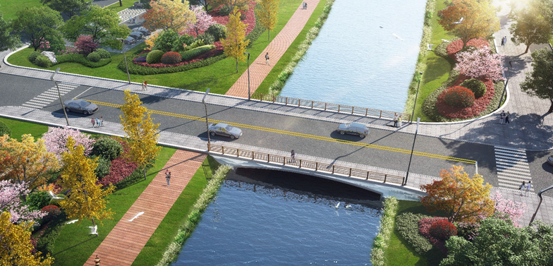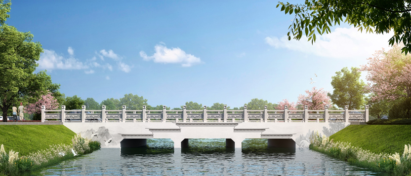 在三座跨越水系桥梁的设计阶段,秉承“一桥一景”的设计理念,着重通过强化桥梁栏杆、外立面装饰以及医院专用管线过桥空间研究等细节设计,显著增强了桥梁的整体景观特色。其中,一号桥采用多孔钢筋混凝土框架结构,外立面装饰融入徽派马头墙元素,并配以传统山水彩绘,整体呈现朴素优雅之风。