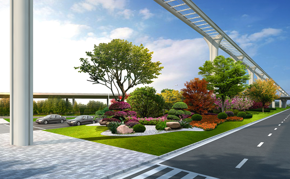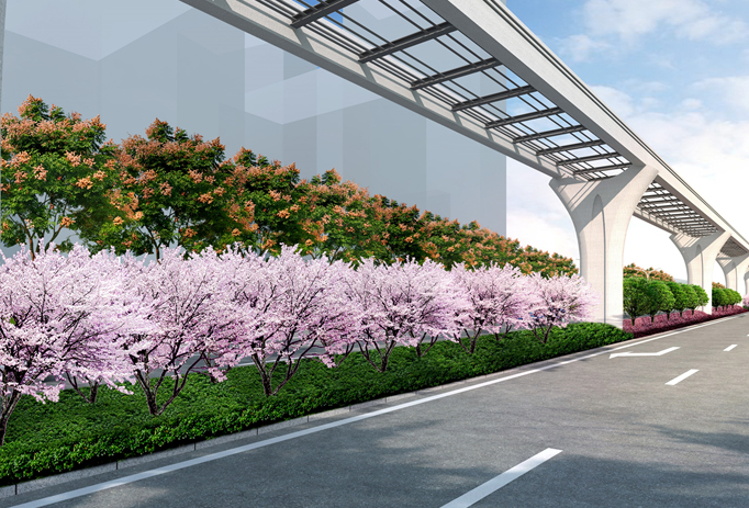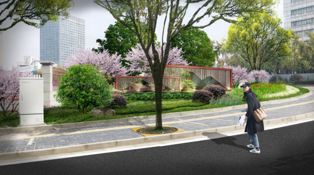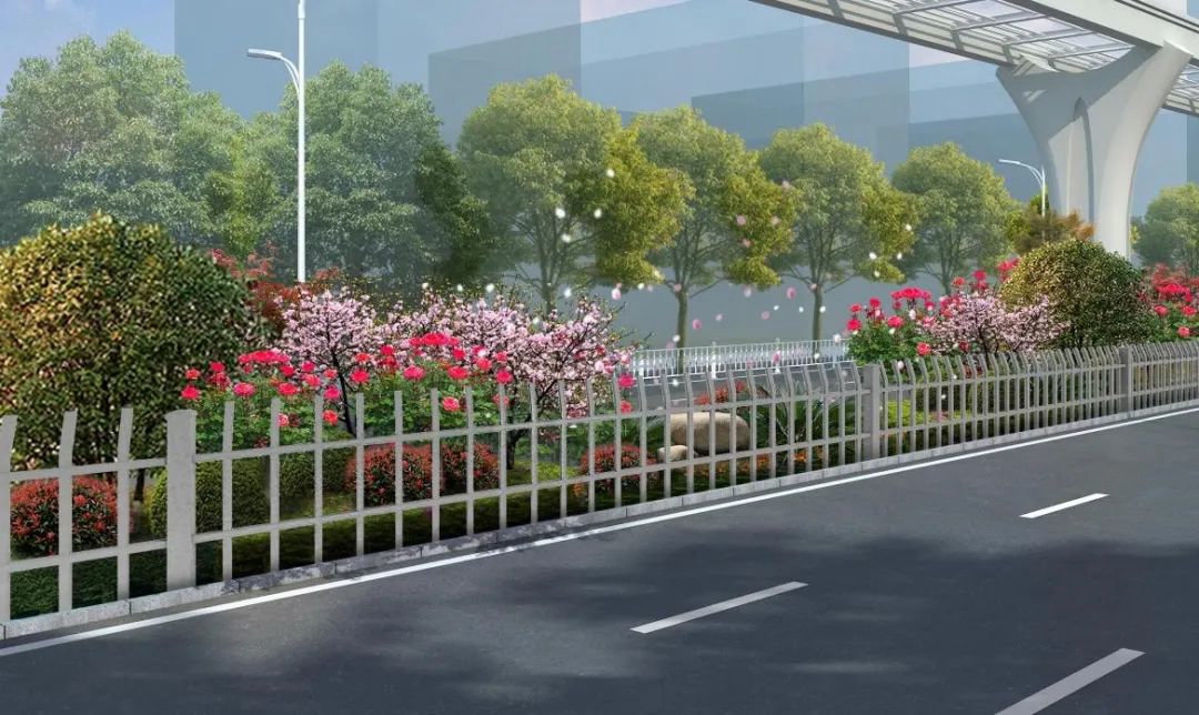 轨道交通地面道路改造工程着重提升沿线道路工程品质、打造一流的景观绿化设计。中心城区人行道侧石等附属设施大多比较老旧,部分路段行道树缺失,路口街头小品简单、层次少,缺乏标识性和艺术性,文化感弱,公共设施无遮挡,为响应人民城市建设,中心城区路段人行道设计采用仿石砖,侧平石采用花岗岩材质,对缺失的行道树进行补种,延续绿廊,梳理轨道沿线边角绿化,保证沿线绿量饱满,色彩丰富,特色鲜明。