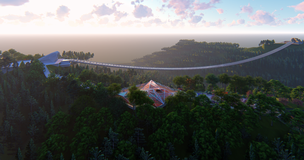 项目定位:设计方案含桥梁、建筑及景观等方面,并包括桥体、锚台及引线方案设计,设计出以爱情为主题,结合先进科技手段,具有6项世界第一的5D玻璃悬链桥。